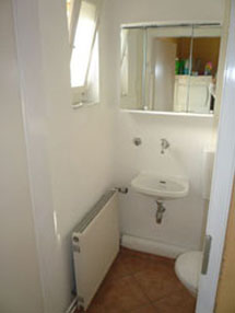 Das externe WC ist mit Hänge-WC, Spiegelschrank und Fliesenboden ausgestattet. Die Dusche befindet sich intern im Zimmer.