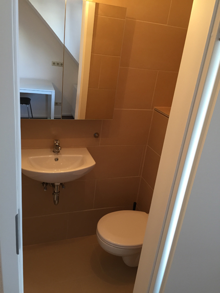 Das Badezimmer ist mit Fliesenboden ausgestattet. Echtglas-Duschkabine sowie Hänge-WC und Spiegelschrank gehören zu unserem Standard.