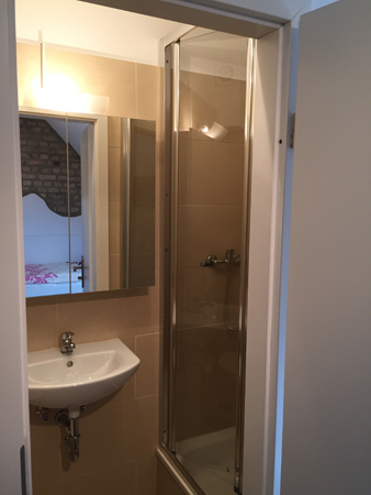Das Badezimmer ist mit Fliesenboden ausgestattet. Echtglas-Duschkabine sowie Hänge-WC und Spiegelschrank gehören zu unserem Standard.