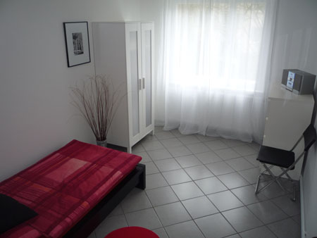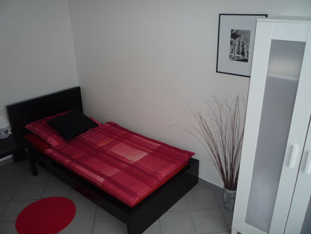 Das weitere Schlafzimmer ist mit einem Bett, Schubladenkommode, Stuhl sowie einem Kleiderschrank und einer Stereoanlage ausgestattet.
