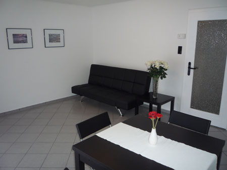 Das helle Wohnzimmer ist mit einer Schlaf-Couch, einem Esstisch 90 x 90 (ausgezogen 180x90cm), 4 Stühlen, Beistelltische, TV mit Kabelanschluss sowie einem schönen Balkon ausgestattet.