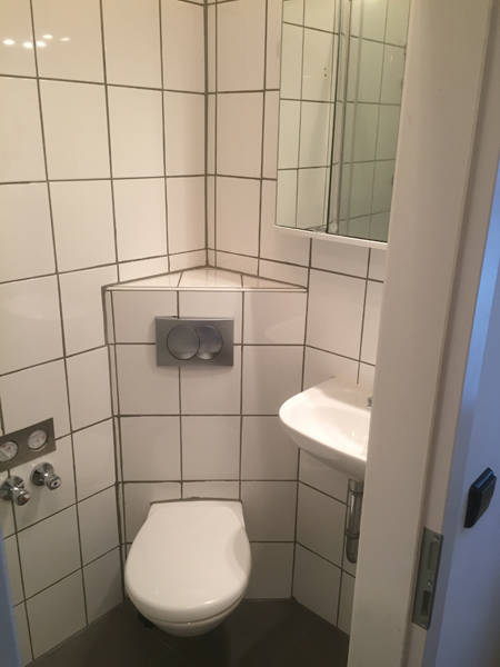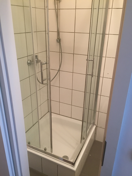 Das Badezimmer ist mit Fliesenboden ausgestattet. Echtglas-Duschkabine sowie Hänge-WC und Spiegelschrank gehören zu unserem Standard.